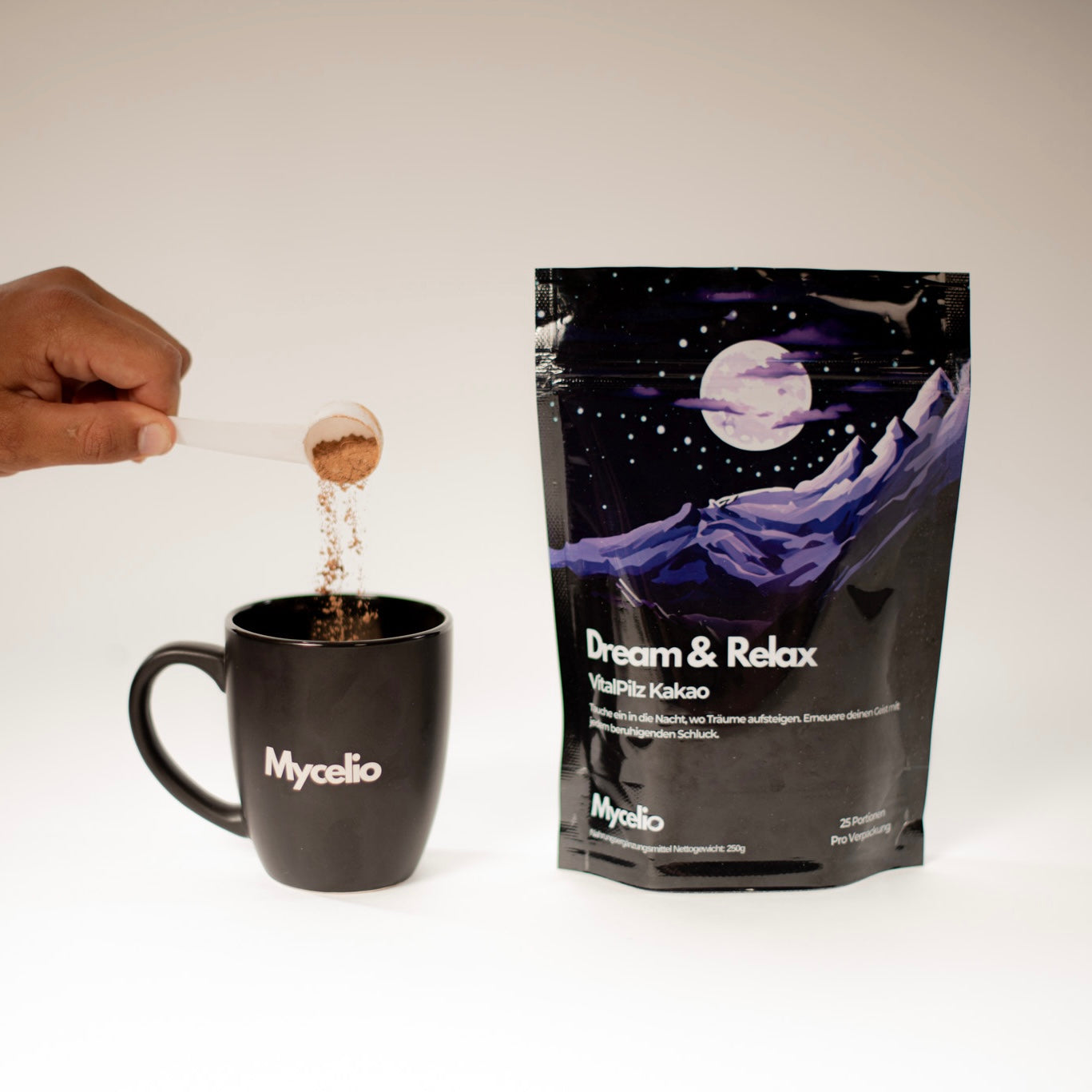 Für unsere Vitalpilz Kakaos Dream & Relax und Rise & Shine empfehlen wir, um die empfohlene tägliche Dosis an Vitalpilzen von 750mg zu erhalten, 30g (= ca. 2 EL) unseres köstlichen Vitalpilz Kakaopulvers in etwa 200ml Pflanzenmilch zu mischen. Auf diese Weise erhältst du nicht nur ein belebendes Ritual, sondern auch einen wertvollen Beitrag zu deiner Gesundheit und deinem Wohlbefinden.